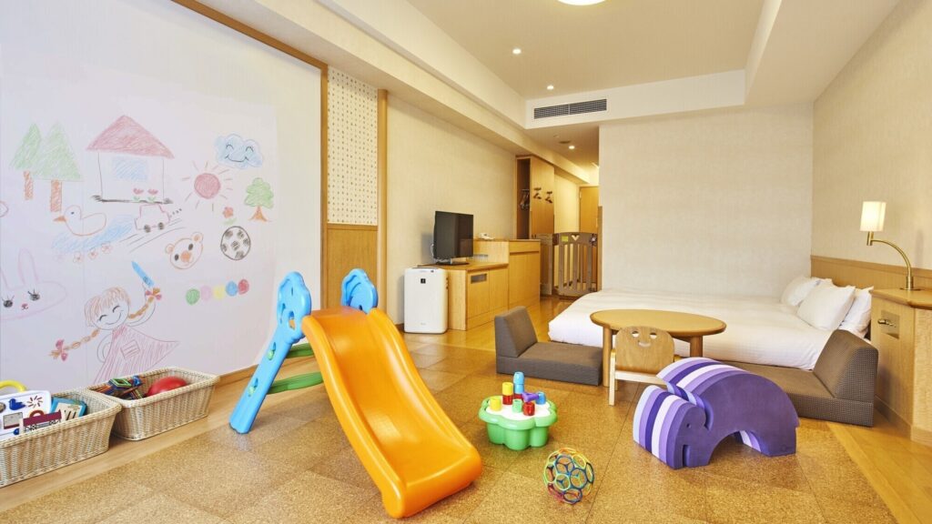 キッズプレジャールームには遊具やお絵かきボードがあり、ベッドもローベッドなので安心です。