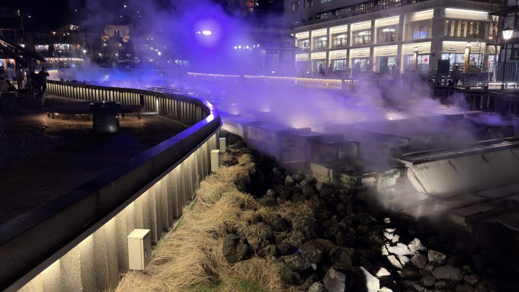 川沿いにはいくつか足湯もあり、多くの観光客が足を浸してゆったりと楽しんでいる姿が印象的でした。
