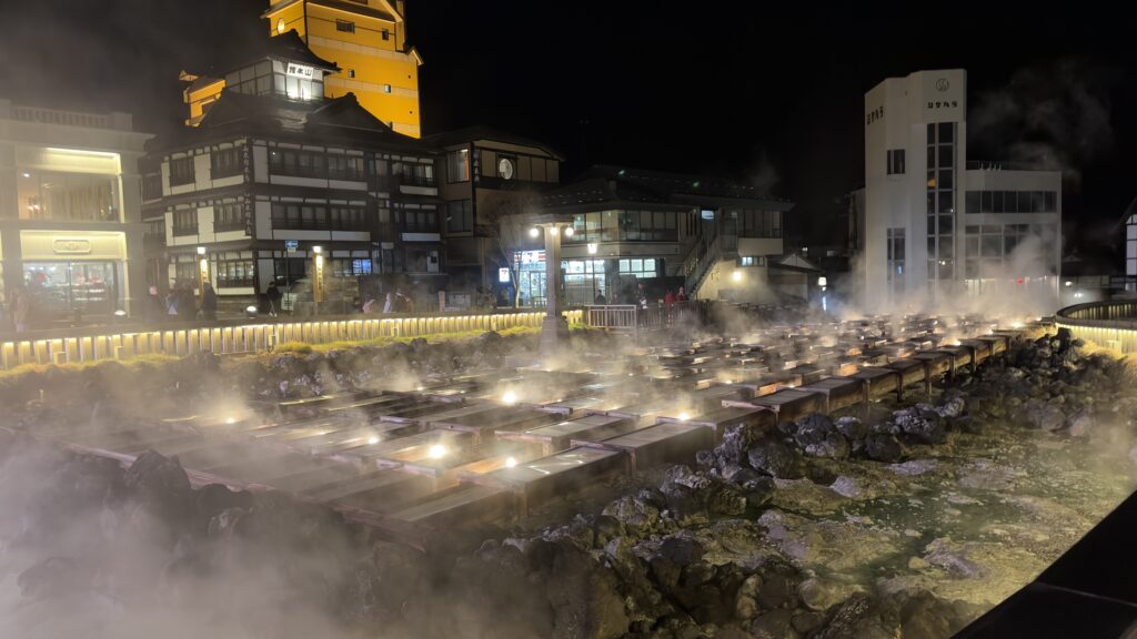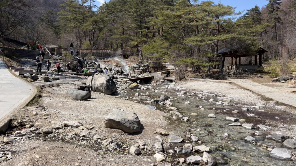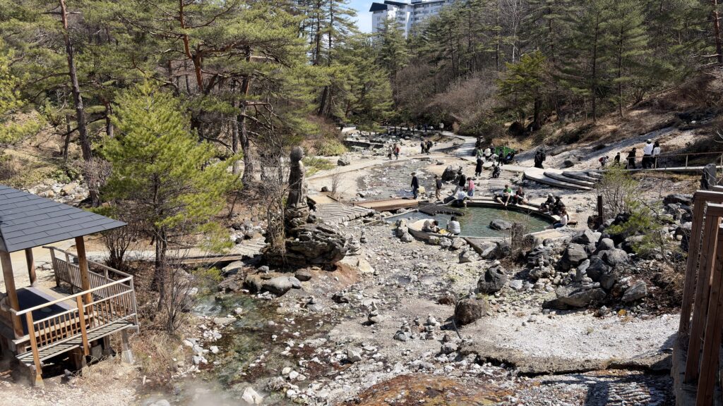 岩場が広がる独特の景観と、足湯を楽しむ人々の賑やかさが共存する、草津ならではの風景を感じることができました。