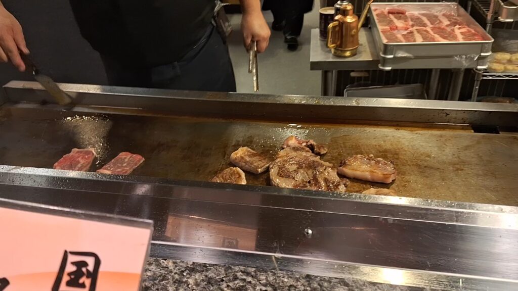国産和牛ステーキコーナーでは、鉄板から炎が上がるたびに料理長の「イヤッホー!バキューン!」と楽しいマイクパフォーマンス!お肉がやわらかくいままで食べたステーキの中で1番おいしかったかも。