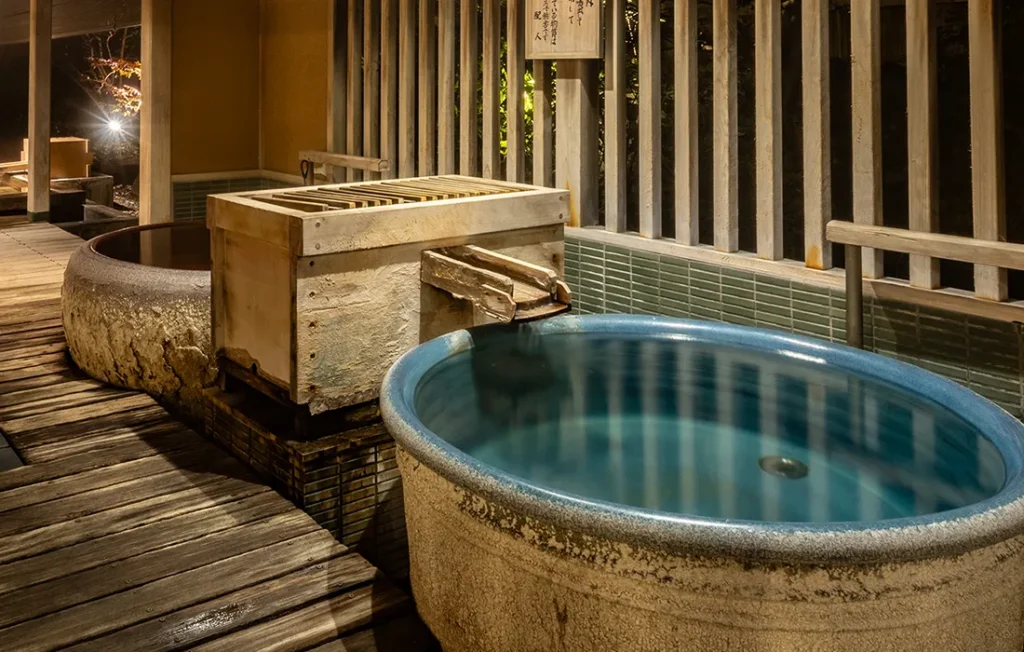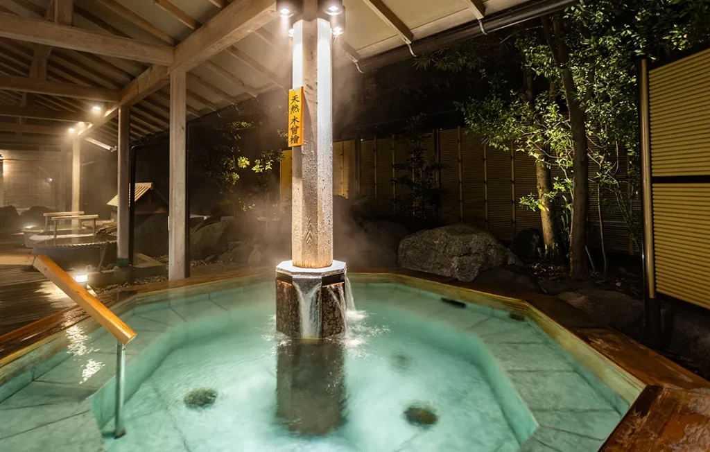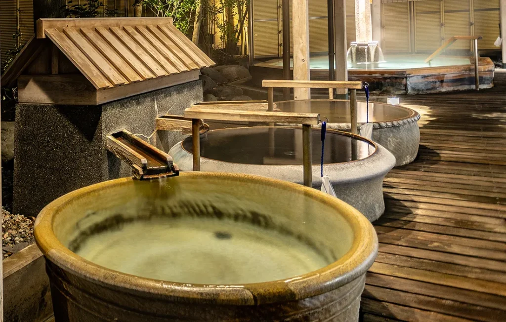 八角腰掛風呂、陶器風呂、露天風呂、サウナがあり湯めぐりも楽しめます。