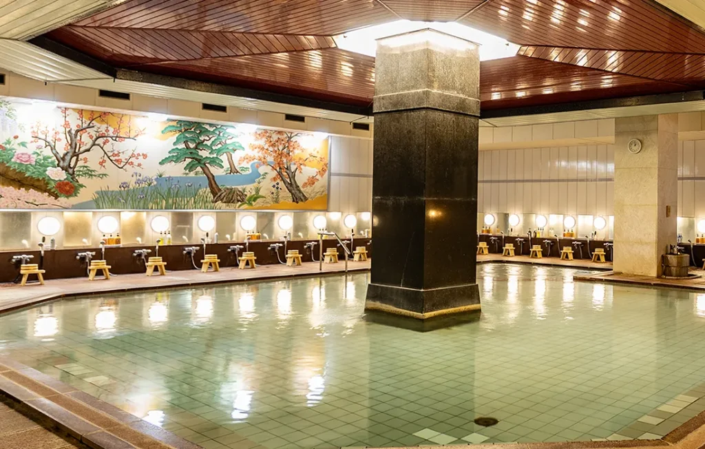 男性大浴場には広い湯船と壁には桜や梅、松の絵が描かれており華やかな印象です。
