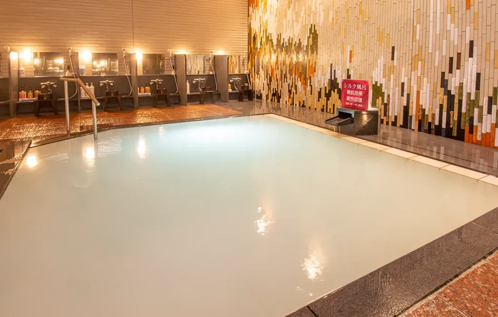 男性大浴場にはない「シルク風呂」も楽しめます。ミクロの泡による真っ白なベールのようなお湯を身にまとい、美肌の効果も期待できます。